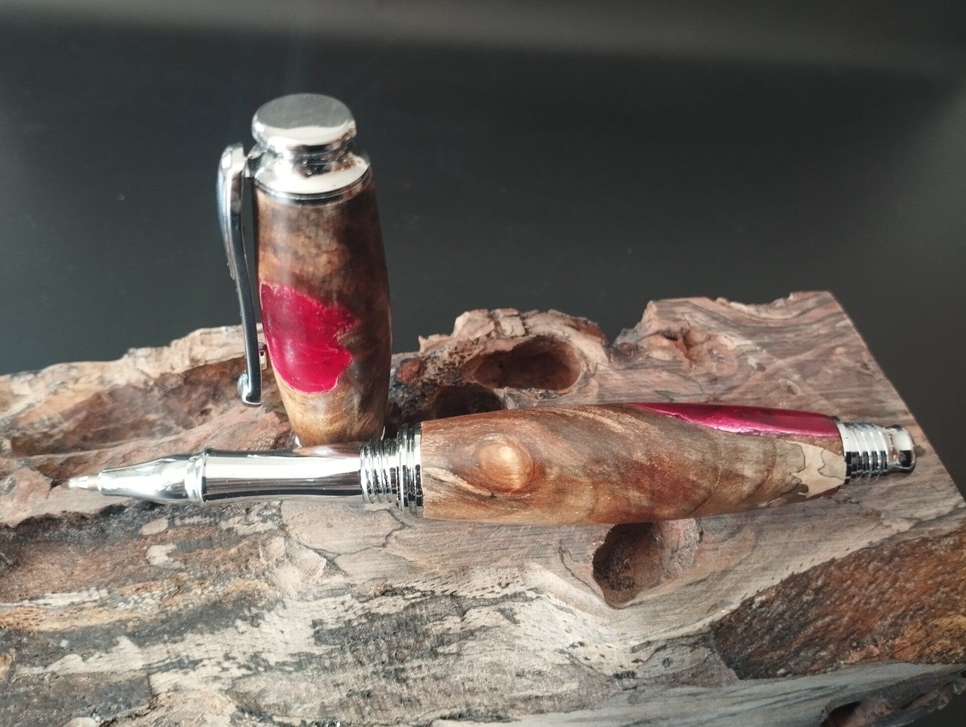 Ce stylo roller Aston hybride bois et résine rouge est unique et monté sur un mécanisme chromé brillant .