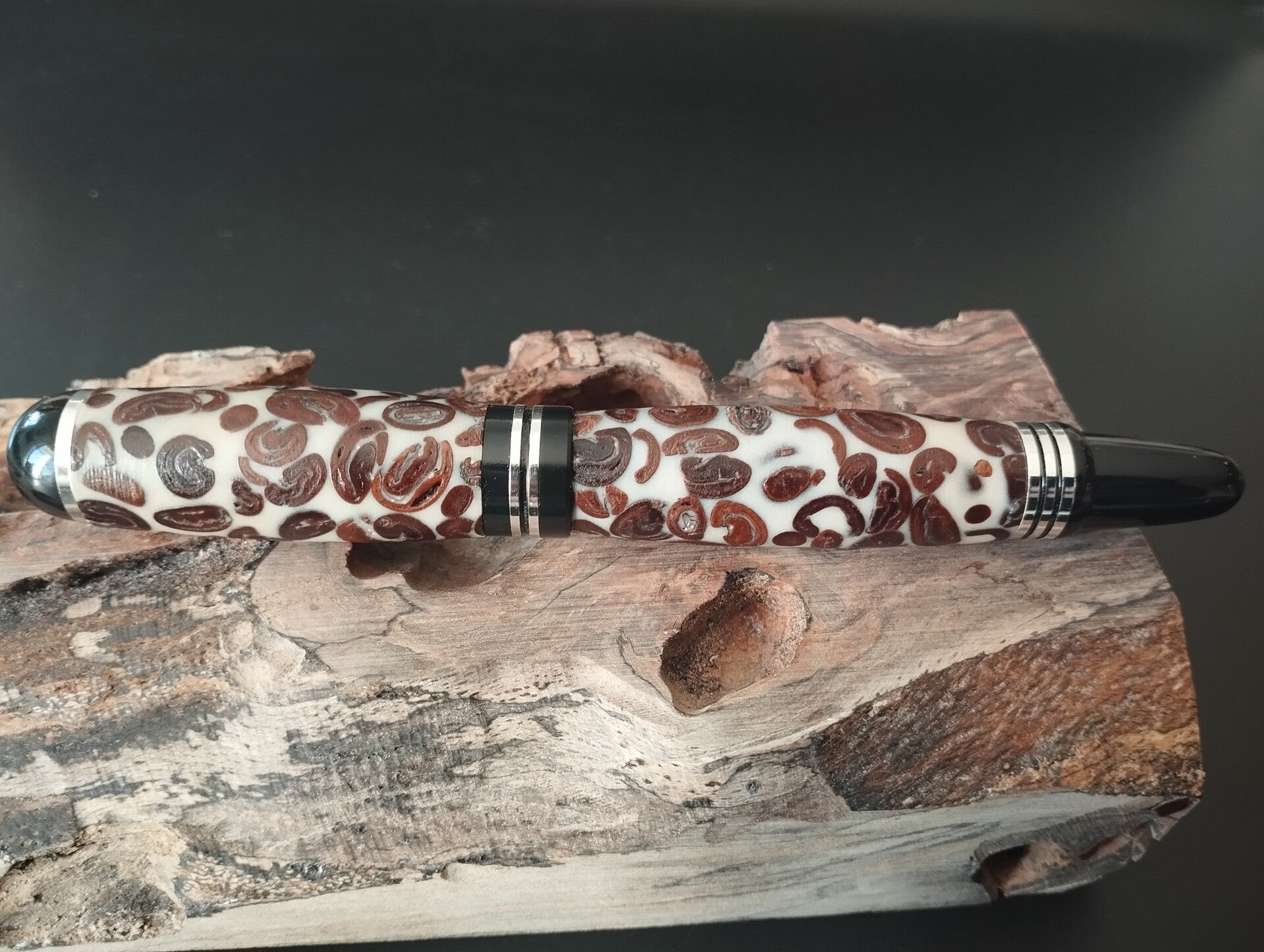 Ce stylo roller Churchill en Grain de café et Résine Blanche est unique et monté sur un mécanisme chromé brillant .
